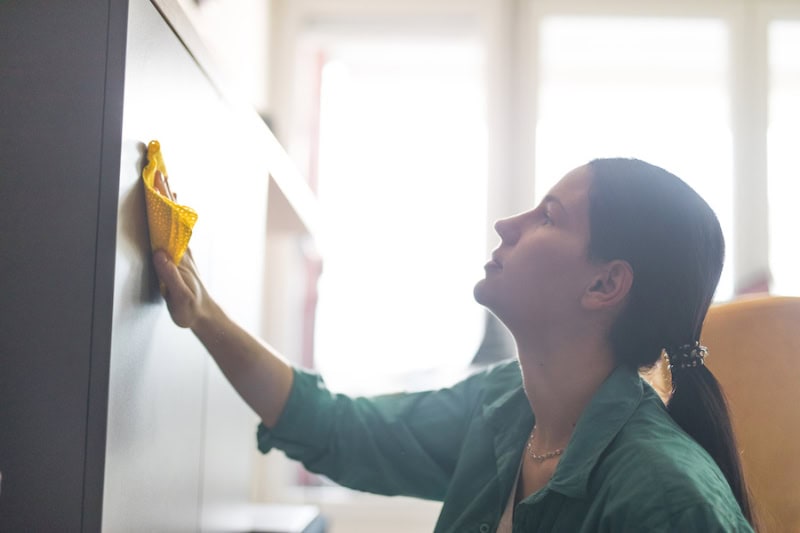 - Dust with a microfiber or damp cloth, starting the cleaning motion from top to bottom to grab and remove dust and not push it into the air.